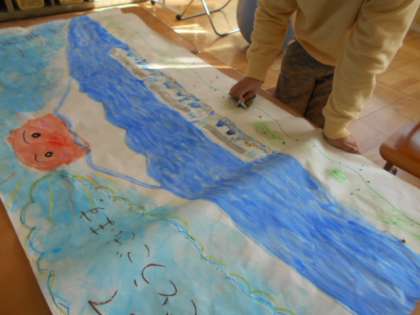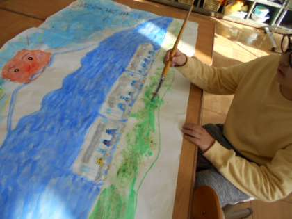図工では1月の掲示板の絵の続きをしました。列車が通っている地面の緑をクレパスのこすり絵や絵の具で工夫して描きました。
