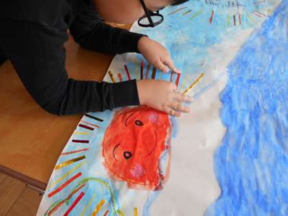 少しずつ作成を続けてきた,新年1月の掲示板の絵が完成しました!今日は新年のイメージを引き立てる,日の出と新年のお祝いの言葉の周りを,きらきら光る折り紙を使い光の様子として貼り付け,飾りました。新年の明るい様子を表すことができました。大好きな電車も描くことができ,すてきな作品になりました。新年に飾るのが楽しみです!