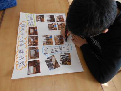 生活単元学習で,「認知症サポート体験」の写真で活動をふりかえり,掲示物を作りました。写真を見て,「(認知症の方役の)〜さんに,この2人の人はケーキの話に夢中になっていて,気づきませんでした。」と細かく憶えていたことを話すこともできました。