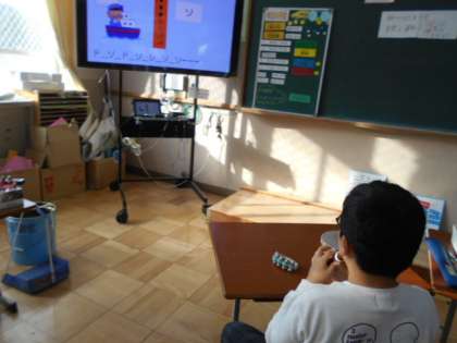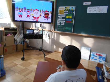 毎朝,1時間目に学習している「日常生活の指導」の時間には,その月の季節をテーマにした歌とリコーダーとダンスをしています。今は12月なのでクリスマスや12月の北風をテーマにした歌を動画を見ながら歌っています。リコーダーは動画のドレミを見ながら,音に合わせて吹いています。