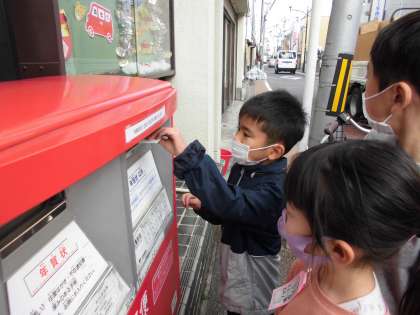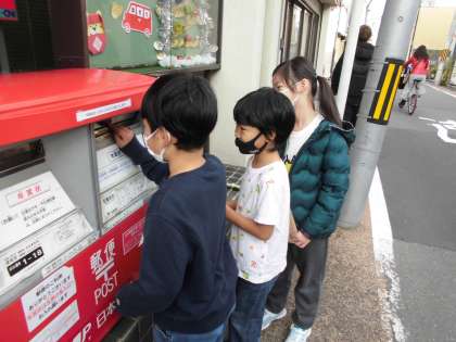 今日は,みんなでそろって,昨日清書した手紙をポストに投函しにいきました。「今までに自分で入れにいったことある人?」とたずねると5,6名の子どもたちが手をあげてくれました。そんなわけで,みんな今日はとてもうれしかったようです。この学習で「誰かに手紙を出す楽しさ」を味わえた子どもたちに,「お返事が届くうれしさ」も味わえますように!!