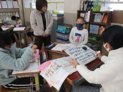 この日も,6年担任が5年生の教室で,家庭科の指導をしていました。