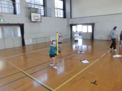 今日は棒を使って,手の上にのせてバランスをとったり,手を放して壁にタッチしてかえってきたりして,いろいろな遊びを楽しみました。