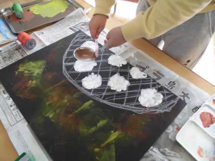 京都市内の小・中学校の育成学級の児童・生徒の作品展,「小さな巨匠展」の作品作りを引き続き,頑張っています。絵画は,黒い色画用紙に,絵の具とクレパスでおもちを描きました。立体作品は,ブランコと自分を紙粘土で作り,色を塗り,ニスを塗りました。