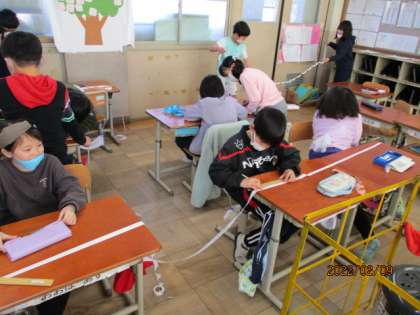 算数の学習で「100cmをこえる長さ」の学習をしました。そのまとめとして,5mの長さのものさしを協力してつくりました。