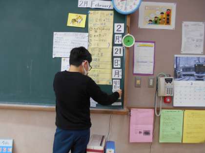 毎日,登校後,タイマーを使い時間を意識しながら朝の会までに,月日曜日・天気・時間割の掲示をしています。そのときに,タイムスケジュールを掲示して,今すること・次することを意識した動けるようにしています。
