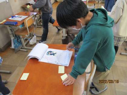 子ども達は,それぞれに付箋をもち,友達の作品を読みに行きます。そして,
