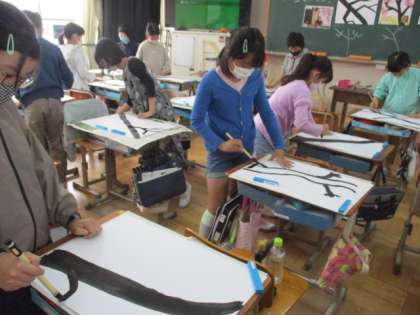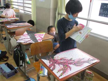 図工の学習で「桜」を描きました。幹や枝は墨をつかってダイナミックに描き,桜の花びらは指で絵の具をトントンして表現しました。一人一人幹の太さが違ったり,枝の生え方が違ったりして味わい深いです。また,色もピンク一色ではなく,赤や黄色,黄緑も入ってとても綺麗です。教室の後ろに貼っていますので,ぜひご覧ください。
