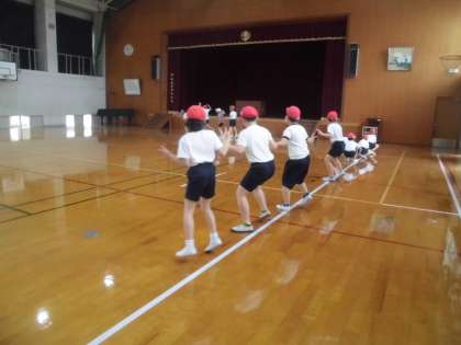 グループごとに,先頭の友達の真似をしながら体育館をぐるぐると歩きました。