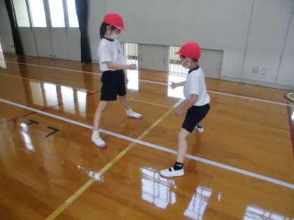 前半は,これまでに学習したことを組み合わせて,けんけんぱや好きなジャンプ,体動棒を使ったバランス運動などしながら,体育館をぐるりと周りました。