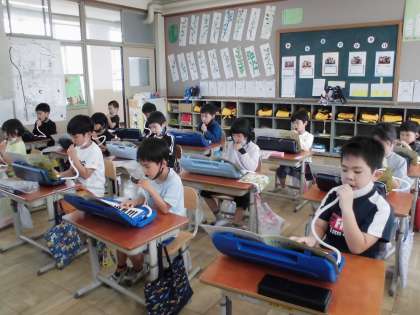 今日の音楽は本当に久しぶりのけんばんハーモニカをしました。トゥトゥトゥのけんばんことば(タンギング)から思い出して,1年生で練習した曲を順番に演奏してみました。