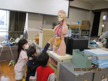 「理科」という教科はまだ学習していないので,なかなかどんなものがあるのかイメージがしにくかったようですが,いざ理科室に入ってみるとたくさんの実験道具や,模型など楽しそうなものがたくさんあって探検カードにかくものを悩んでしまうくらいでした。