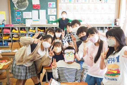 給食を食べた後,ハンカチで遊んでいる6年生。