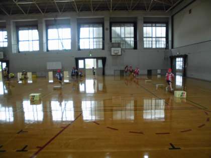 今日は大・中・小の3つの箱を跳び越す「ぴょんぴょんリレー」です。