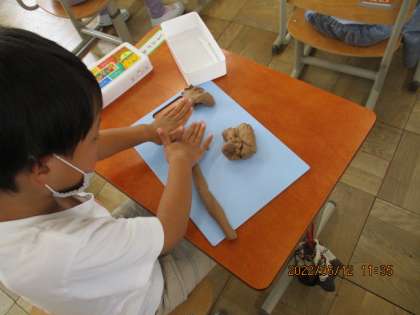 始め,硬くなっている粘土の塊を目覚めさせる「粘土体操」というものに取り組みました。ちぎる,つぶす,たたく,まるめる,まとめる,などの作業をしながら,粘土を徐々に柔らかくしていきました。