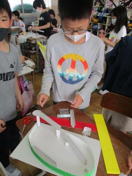 ビー玉が転がって楽しいコースを考えて,工夫して作っています。