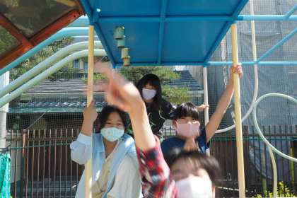 卒業アルバムの個人写真を撮る待ち時間に遊具で遊ぶ6年生。