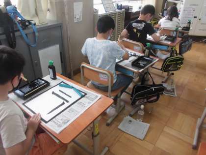 そして,筆に墨液をつけて線を書きました。力の入れ方を調節し,細い線や太い線を書いたり,ジグザグの線などを書いたりしました。