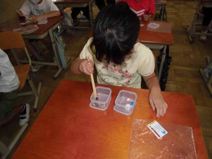 今週,2年生になって初めての食の学習がありました。今回のテーマは「おはし名人になろう」でした。事前にアンケートをとって,自分の持ち方について少しふりかえっておいての,この日の学習でした。まず正しい持ち方を確かめて,少し練習をしてから,「この持ち方でいろんなものがはさめるかな」という活動に挑戦してみました。レベル1のテイッシュからスタートして,レベル5まであがっていきました。私もやってみましたが,やはりレベル5の大豆はちょっと手ごわかったです。今日,この日の振り返りのプリントを持ち帰っています。子ども達の感想が書かれているので,目を通してあげてください。