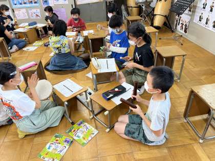 5年生の音楽では,皮でできた楽器,木でできた楽器,金属でできた楽器を使い,リズムの掛け合いを行いました。それぞれの楽器の特徴や,習った「呼びかけ」を駆使し,班でオリジナルのリズムアンサンブルを作りました。
