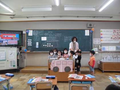 「バスに乗っている人は何人か考えよう」というめあてのもと,実際にバスごっこをしながらお客さんが乗ったり降りたりする様子を見ていきました。