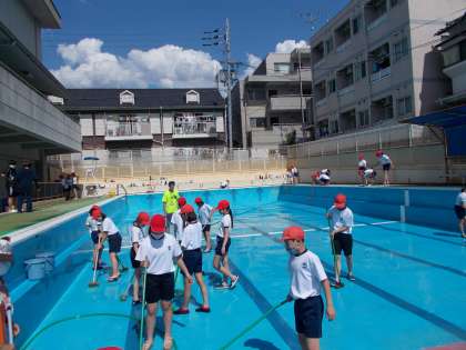 晴天のもと,5・6年の児童が,プールを隅々まできれいにしてくれていました。