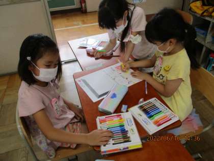 学活の時間を使って係のカードをかきました。それぞれの係で一枚を仕上げる,という中々難しい作業なのですが,そこは1年1組の子供たち。みんなで協力し合って仕上げていました。カードを渡して,こんな風にかくよ,とだけ説明をしたので,わからなかったら聞きに来てくれるかな?と思いながら見守っていました。