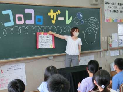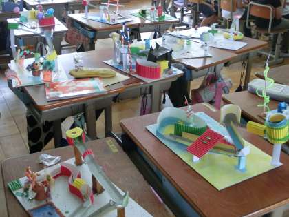 4年生は図工「コロコロガーレ」で作った,ビー玉を転がして楽しむ作品を紹介し合っていました。
