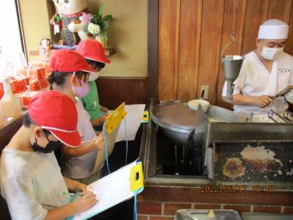 今日は,「安心安全ステーション」「わがしのお店」「いなりせんべいのお店」のグループがたんけんへ行かせてもらいました。どのグループも昨日からわくわく楽しみにしていたので,はりきって出かけていきました。帰ってきた子たちの質問用紙を見てみると,答えていただいたことを一生懸命にメモしている姿が見られました。