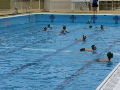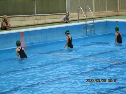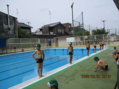 先週は2回ともがまんしたプール。今日はようやく子ども達の笑顔が満開でした。今日の水慣れは2本立てでまずは,いろいろな動物になって水の中を歩きました。犬・わに・あひる・カンガルー・ぞう・かえる・・・・という具合にどんどん変身していきました。そのあとはお楽しみの宝物ひろい。1個拾うごとにプールサイドまで置きにいって,また次の1個をさがしにいくようにしたので,どの子も水の中でしっかりと歩き回ることができていました。あっという間に終わりの時間になり,子ども達は名残惜しそうでした。次回は水中に少しずつもぐっていく予定です。