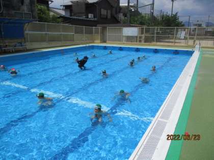 やっと,晴天の中プールに入れました。今日のプールは水位が少し上がり,子ども達も「わあ,深くなった。」と言いつつ,すぐになじんで楽しく活動していました。今日は,カニさんになって鼻から息を吐きだしてみたり,頭までどぼーんとつかってロケット発射をしたり,クラゲみたいにぷっかり浮かんだり・・・。前回よりも少しレベルアップしましたが,みんながんばっていました。
