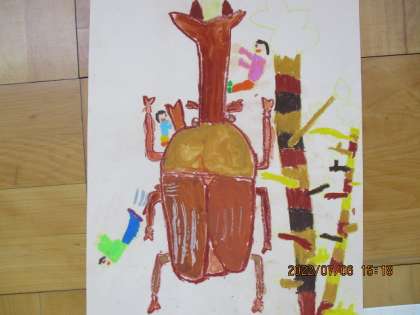 先週から始めていた絵の具での色ぬりを今日は完成させていきました。コンテでの線描のときはよく似た印象だった虫たちが,着色していくにつれてそれぞれに個性のある虫に変身していきました。絵の具が仕上がった子たちから,遊んでいる子ども達を書き加えていきました。やっぱり人が加わると,あたたかい雰囲気になりますね。