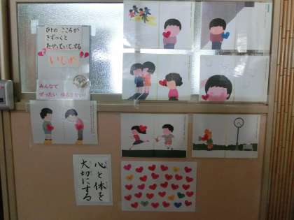 校長室の窓に,お話に使った絵などを掲示しています。