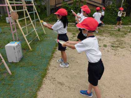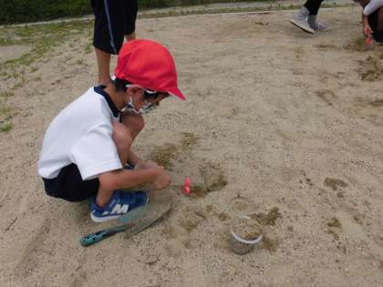 生活科「なつだ とびだそう」の学習で、みんなで運動場に飛び出して砂や水で遊びました!