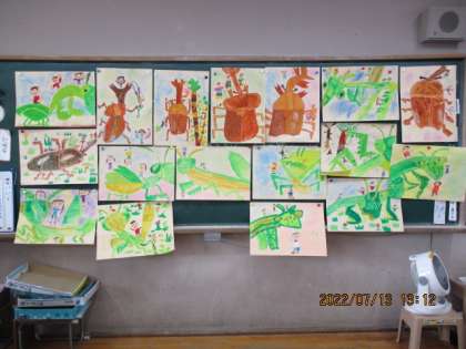 楽しそうに虫と遊んでいる子ども達を描き加えて,「虫とあそぼう」の絵が完成しました。背景は,子ども達が選んだやり方で仕上げていきました。黒板にはっていくと,みんな満足そうに自分の絵を見上げていました。夏休みが明けたら,掲示しようと思います。
