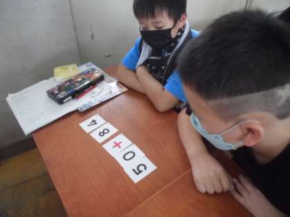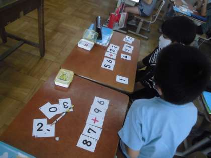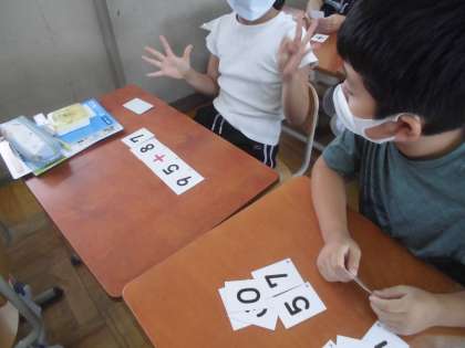 練習問題に取り組んだ後,数カードを使って友だちと計算問題の出し合いっこゲームをしました。ゲームをする中で,さらに暗算でできた喜びを味わっていました。