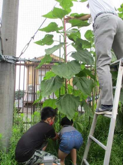 背の高い先生に手伝ってもらって、なんとか自分の班のヒマワリの高さ調べをしました。
