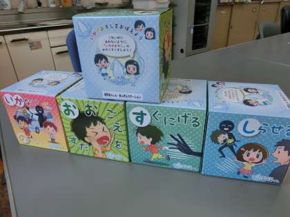 「いか」は行かない。「の」は乗らない。「お」は大声を出す。「す」はすぐに逃げる。「し」は知らせる。子どもたちもよく知っている合言葉です。大喜びで、箱を眺めていました。