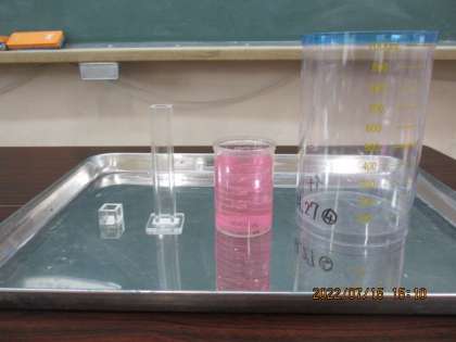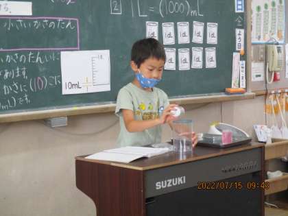 1学期最後の単元に入っています。春に学習した「長さ」の内容をおもいだしながら,進めています。「リットル・デシリットル」とかさの単位が登場してきて,今日はいよいよ「ミリリットル」の出番でした。「1リットル・1デシリットル」の関係と「1センチ・1ミリ」の関係は10個に分けた一つ分というところで同じなので,子ども達も考えやすかったようですが,今日は「1デシリットルの10個に分けた一つ分は10ミリリットル」ということで,一気に「???」という反応の子どもたちでした。実際に「1ミリリットルます」や「10ミリリットルます」で水を測り取りながら学習を進めていく中で,少しずつ納得できていったようでした。給食の時間に,牛乳パックをながめながら,200ミリリットルと書いてあることを確かめ,「つまり,デシリットルます2杯分をみんなは毎日飲んでるんやなあ」と伝えると,なるほどーとうなずいてる子ども達でした。
