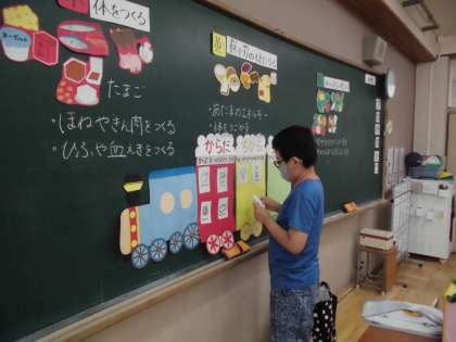 その後は、赤・黄・緑に色分けされた列車を使って、食べ物が体の中でどのような働きをするのか分類していきました。