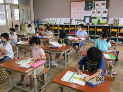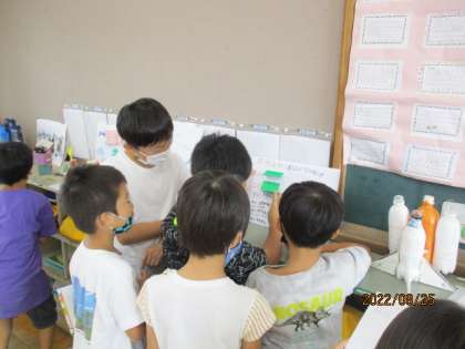 朝から教室に響く元気な声を聞いて,「ああ,始まったなあ。」と感じました。ひさしぶりの友達と早速おしゃべりを始めている子もいれば,私のそばに来て,夏休みの出来事を教えてくれる子もいましたが,どの子も明るい表情で,「みんないい夏休みが過ごせたんだな。」と思いました。休み時間になると,自由研究の並んでいるロッカー前にどっとみんなが集まっていました。「発表会はいつするの?」と尋ねに来た子もいて,やはりとても楽しみなようです。3時間目にはもう「おなかがすいたー」という声もあちこちで聞かれ,あっという間に2学期初日は過ぎていきました。さあ,明日からエンジンかけて行きましょう!
