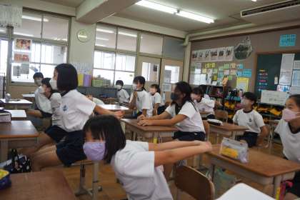 先週の身体計測の日に歯の話を聞きました。歯はどんな時に使われているかということを普段の生活からふりかえり,頬杖をつくと歯が歪んでしまうことがあることを写真から学びました。最後は体を支える筋力もつけよう!ということで最後は姿勢を保つための運動もしました。「痛い,痛い」と言いながら楽しんで体をほぐしていました。