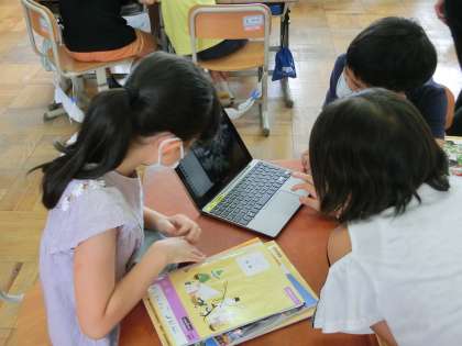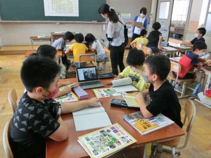 スーパーの様子をタブレットに映して、班のみんなと一緒に活発に考えを交流していました。