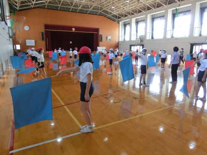 5・6年生は、体育館で旗を使った演技の練習をスタートさせていました。