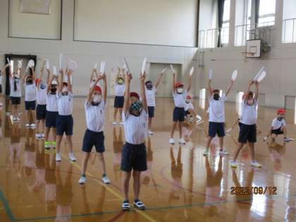 今日からいよいよミニ運動会に向けて,本格的に練習がスタートしました。隣に1年生が並ぶと,やっぱり2年生はお兄ちゃん,お姉ちゃんに見えます。子どもたちも先輩としてがんばるぞという思いでがんばっていたのでしょう。まだ今日で3時間目の練習ですが,舞台の上の万木先生の動きを必死に見つめて,手足の動きを覚えていました。昼休みにもテレビに流した動画を見ながら,踊っている子たちも見られました。