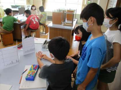 雨の量と川のの水位の変化の関係,土地の変化の様子をグラフや写真を見比べながら,グループで考えました。