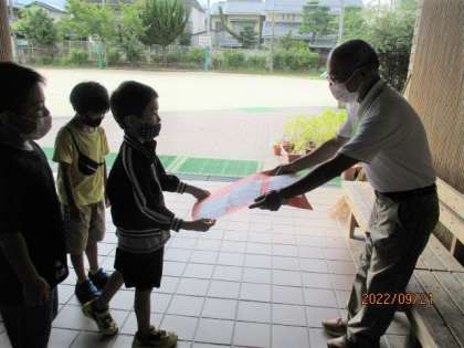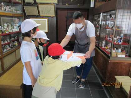 先週に準備をしたお礼の手紙をもって,それぞれにお世話になった方に届けに行かせてもらいました。安心安全ステーションの代表者の方には,毎朝,門のところに立って子どもたちに声掛けをしてくださっているので,そのあとに玄関前でお渡ししました。そして,5.6時間目を使ってまず丹嘉さん,ふたばさんと回りました。