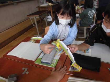 今日は、教科書に付いている天秤を使い、文房具の重さを比べました。