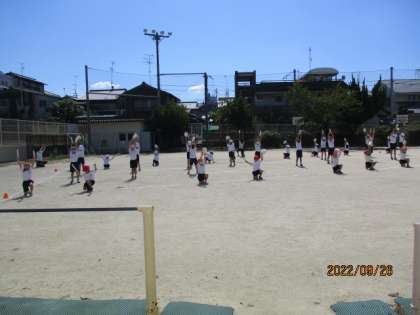 今日は4時間目に,初めて運動場で踊ってみました。先週の涼しさはどこへやら,真夏を思わせる日差しの中で,自分の立ち位置を確かめ,一回通しで踊りました。