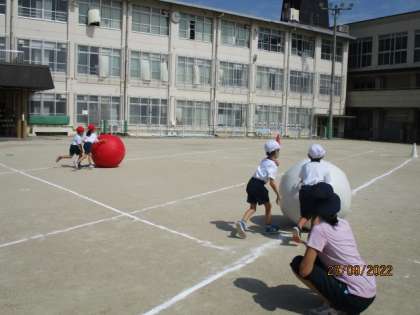 今回は運動場に出て,2年生とも一緒に大玉転がしの